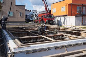 付加断熱施工の様子。 断熱材が濡れないように、断熱材充填後すぐに透湿防水シートを張っていきます。