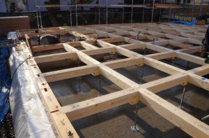 室内の様子。 内側から(柱間)壁断熱材の充填と、天井断熱材の充填が終わりました。