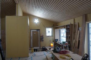 天井仕上げが完成し、壁には石膏ボードが施工されました。 内部造作を行っていきます。